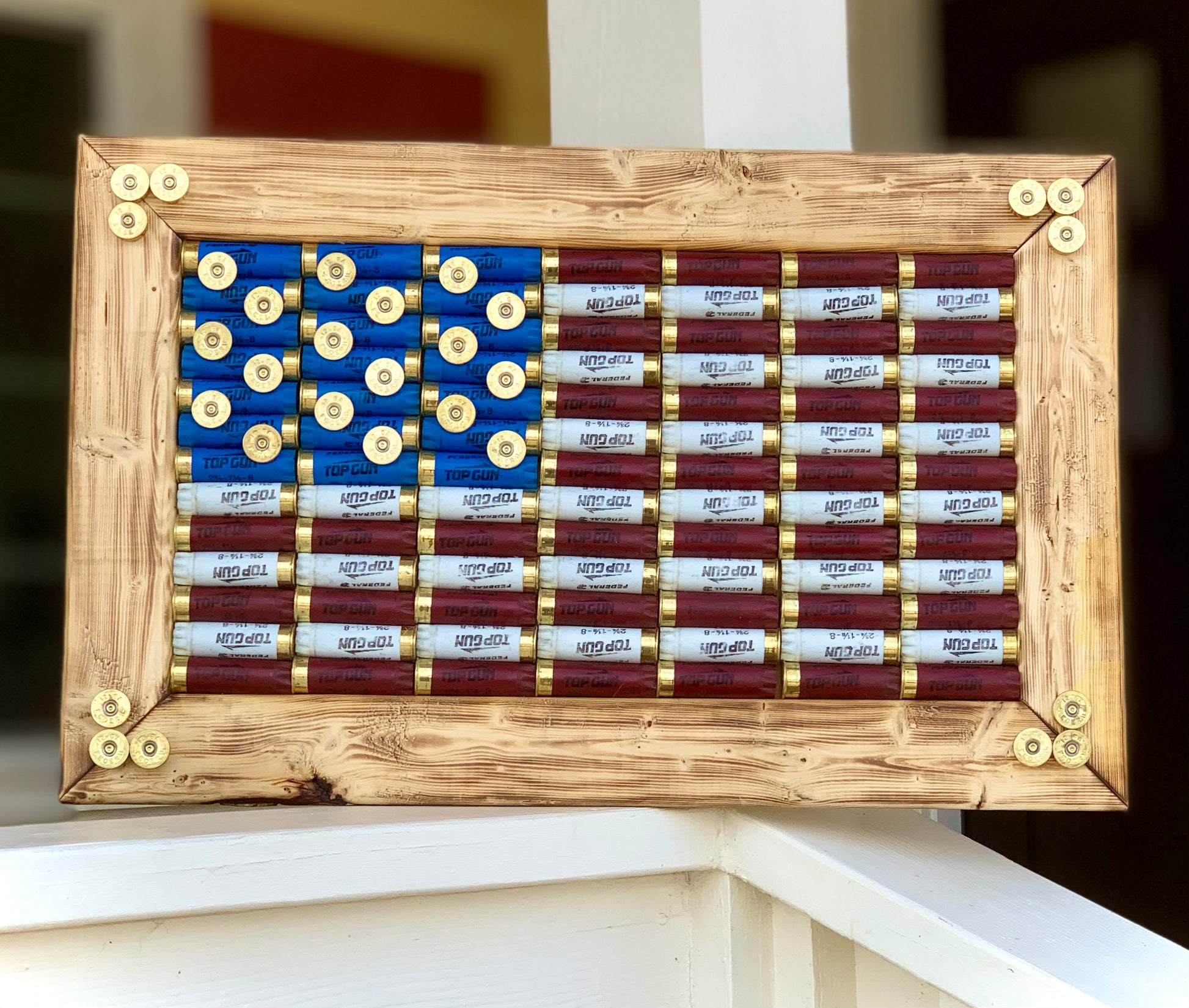 12 gauge American flag made from all federal top gun shotgun shells. Ready to hang on the wall. Shells were shot by youth trap shooters at practice and competitions. Your choice with stars or without stars.