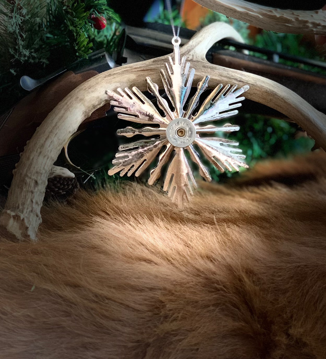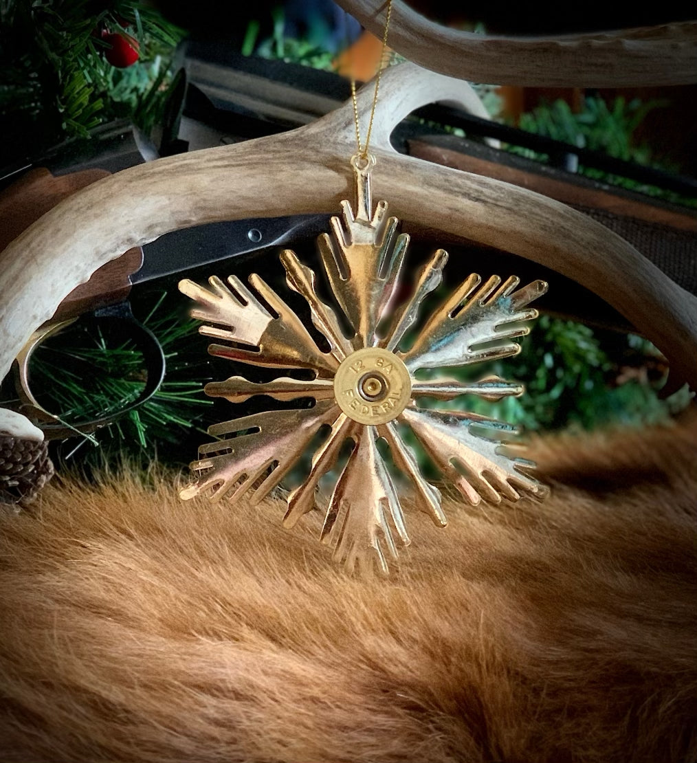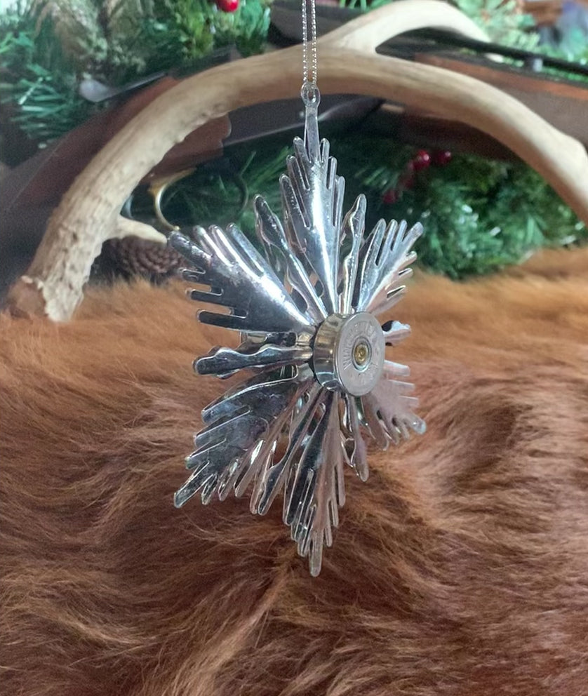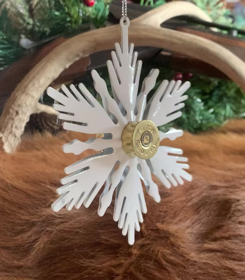 Brighten up your tree with this snowflake adorned with two 12 gauge shotgun shell head stamps. The snowflake is a lightweight metal that comes in Silver, Gold, or White. the snowflake measures about 5”. A shell is placed on both sides of the snowflake in a matching color. The white snowflake has a choice of silver Winchester or gold Federal end piece.